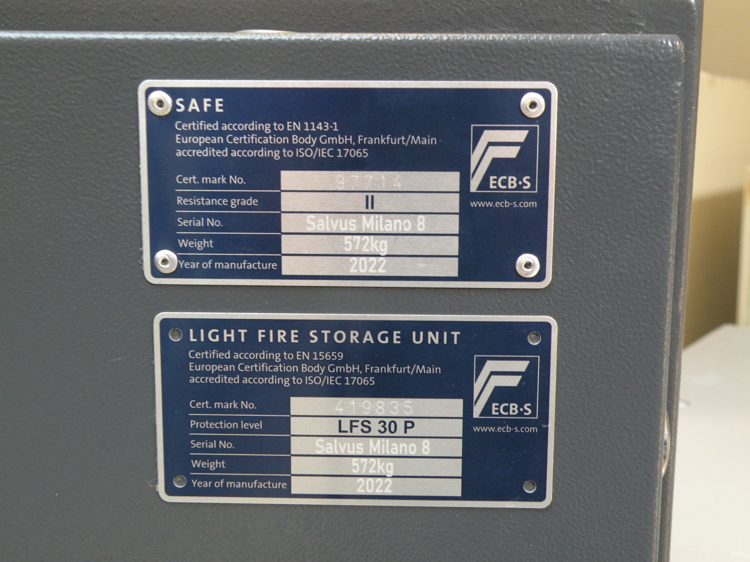 Käytetty SALVIS MILAN 8 -merkkinen palo- ja murtosuojattu kassakaappi.