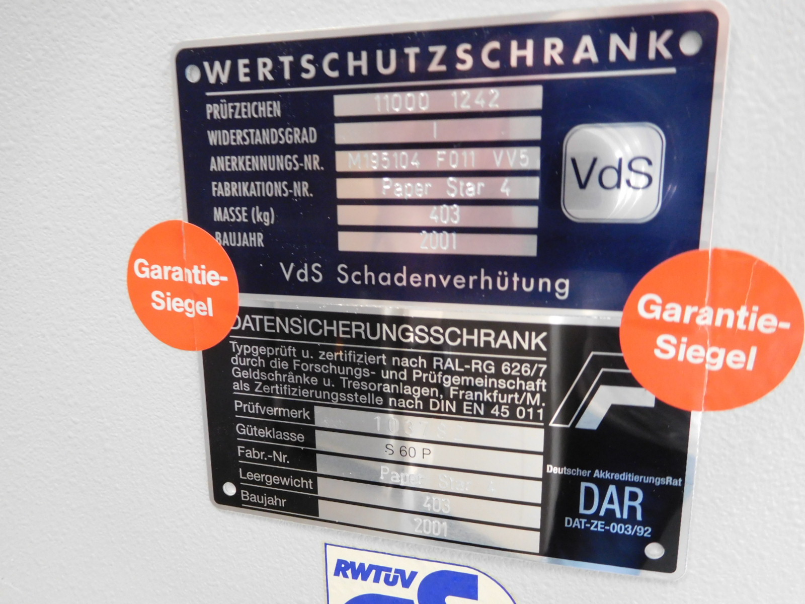 Gecertificeerde brandwering S 60 P 103782 ( 60 minuten voor papier) voor het veilig opbergen van waardevolle documenten en voorwerpen.