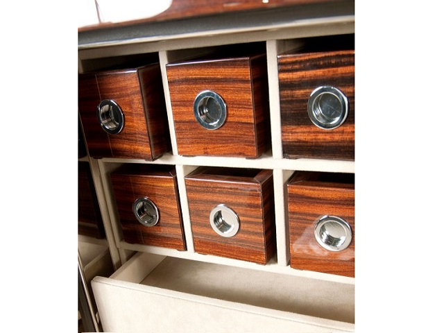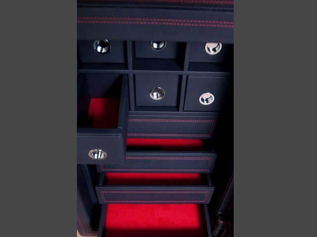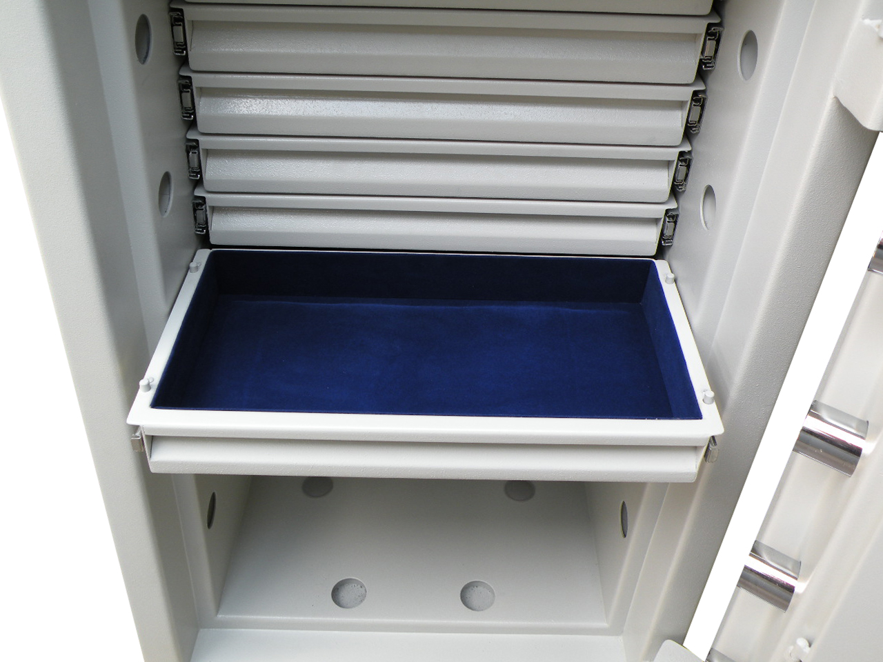 Stel naar wens het interieur van de kluis samen. Vakverdeling in notenhout of gestoffeerde uittrekbare lades, het is allemaal mogelijk.