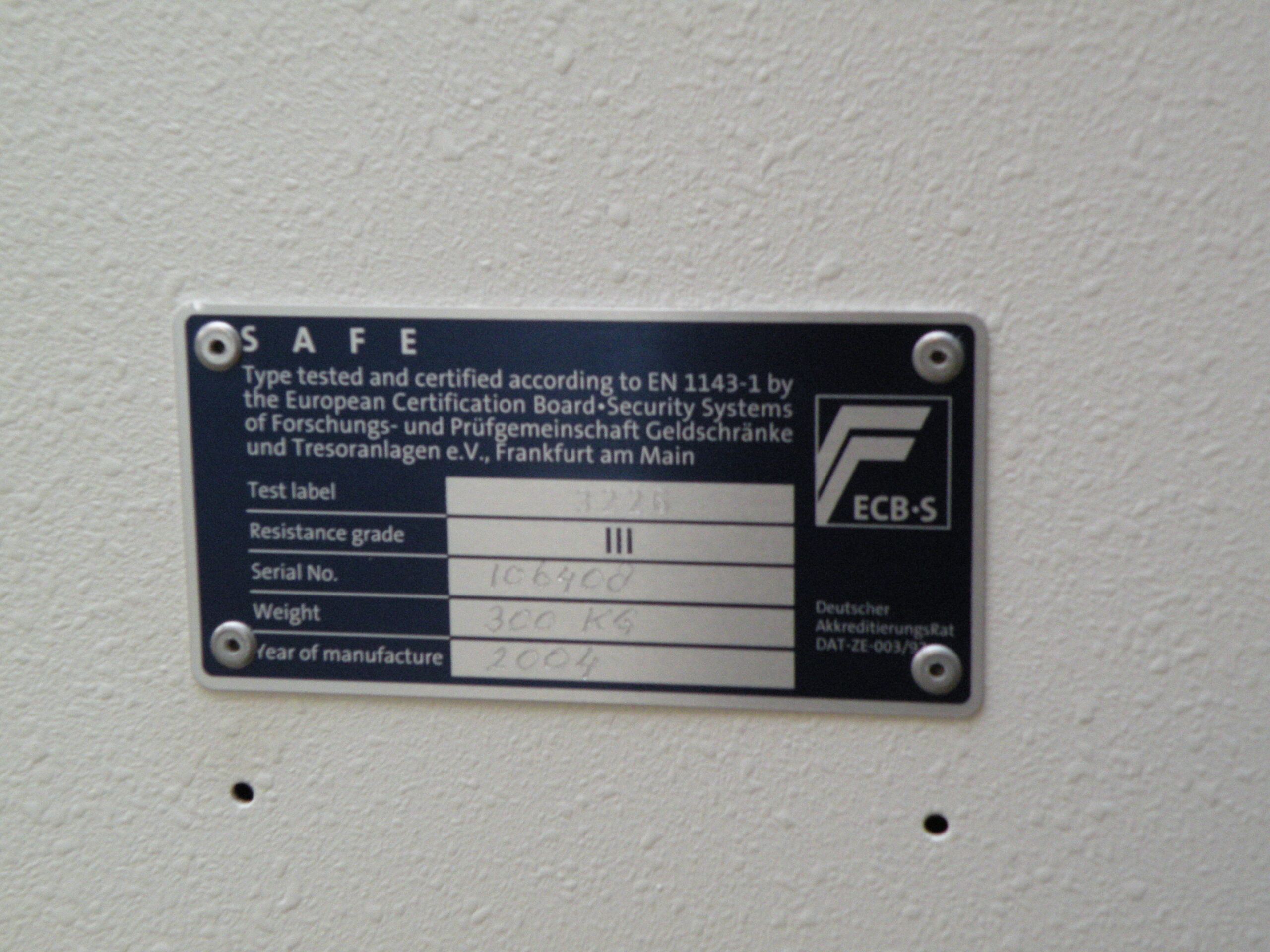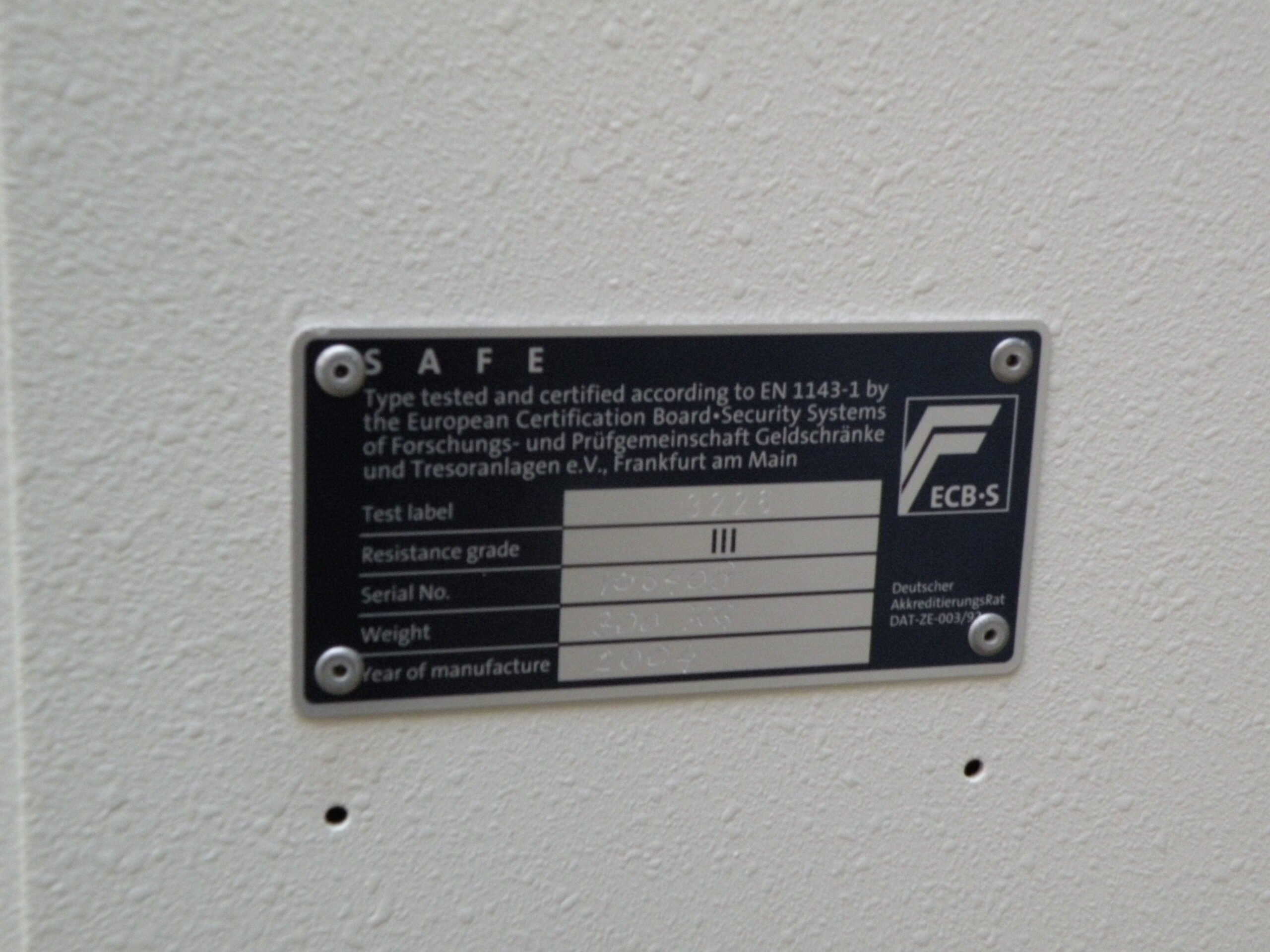 Getest en gecertificeerd conform de EN 1143-1 klasse 3 normering. Dekkingsadvies verzekeraars op basis van normering contant geld € 45.000,00. Kostbaarhedenverzekering € 90.000,00.
