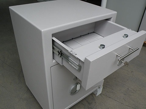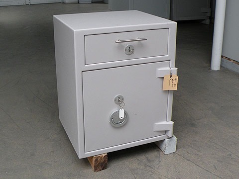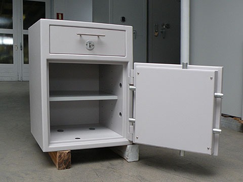 Gebruikte afstortkluis met afsluitbare afstortlade om snel en veilig uw contante geld of andere waarden af te storten of op te bergen, zonder de deur van de kluis te openen.