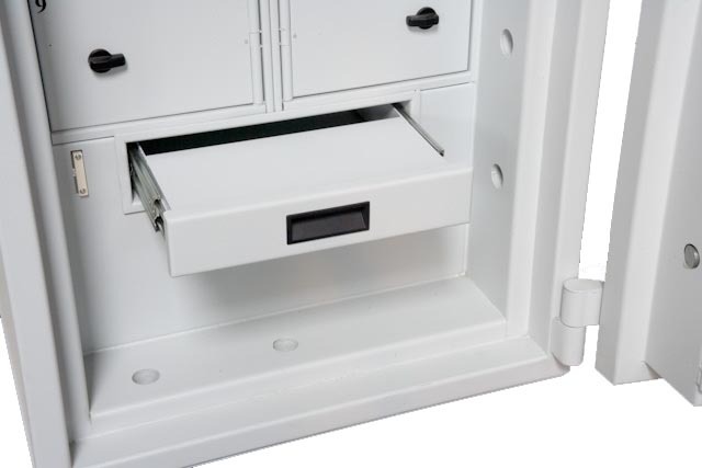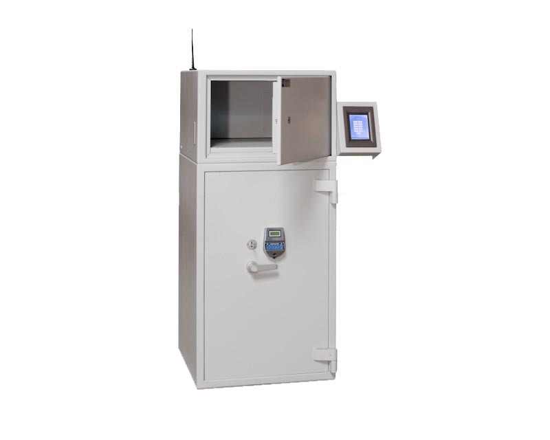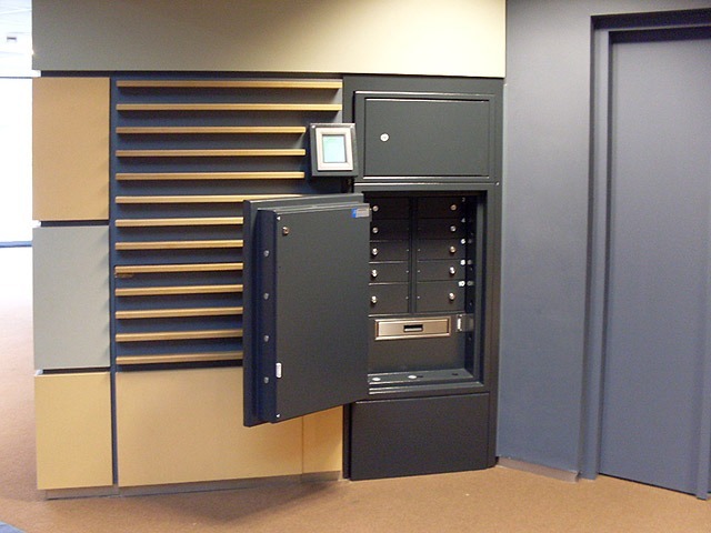 Beide deuren van de overslagkluis zijn uitgevoerd met een dubbelbaards klavierslot en een cijfercombinatieslot. De bankhal zijde is voorzien van een elektronisch codeslot met automatische nachtsluiting.