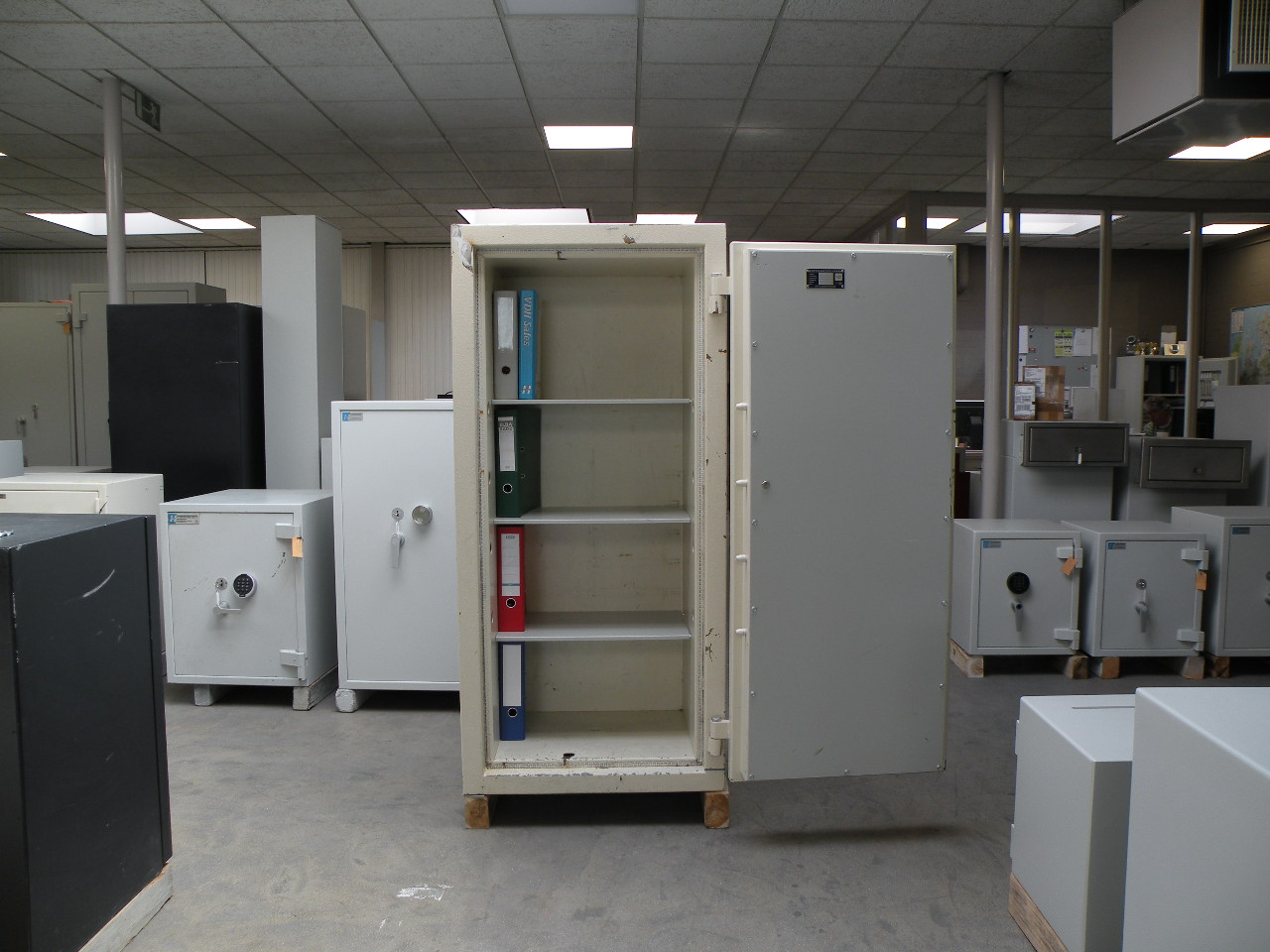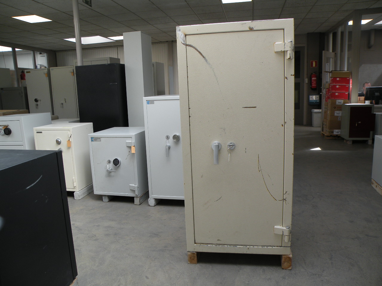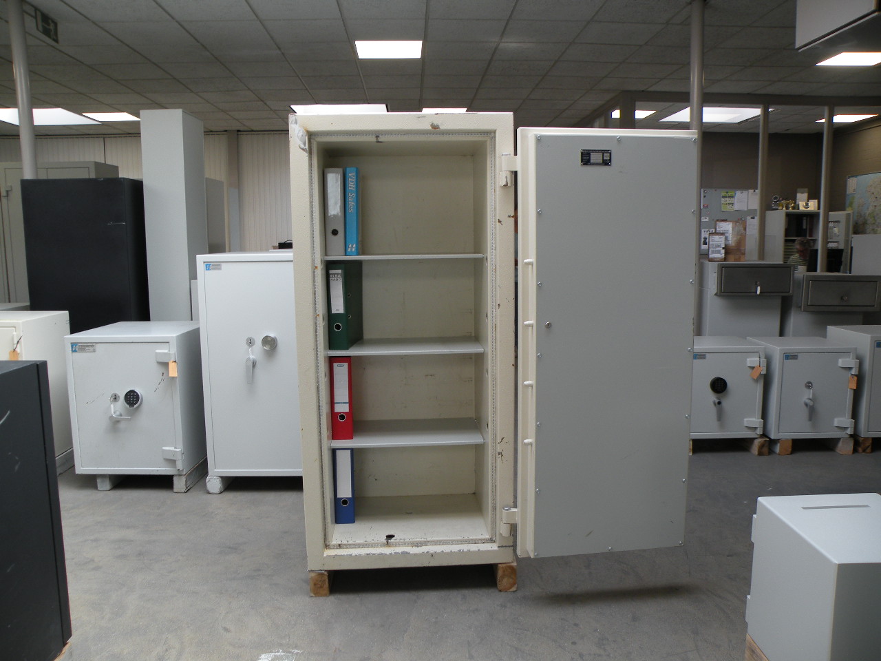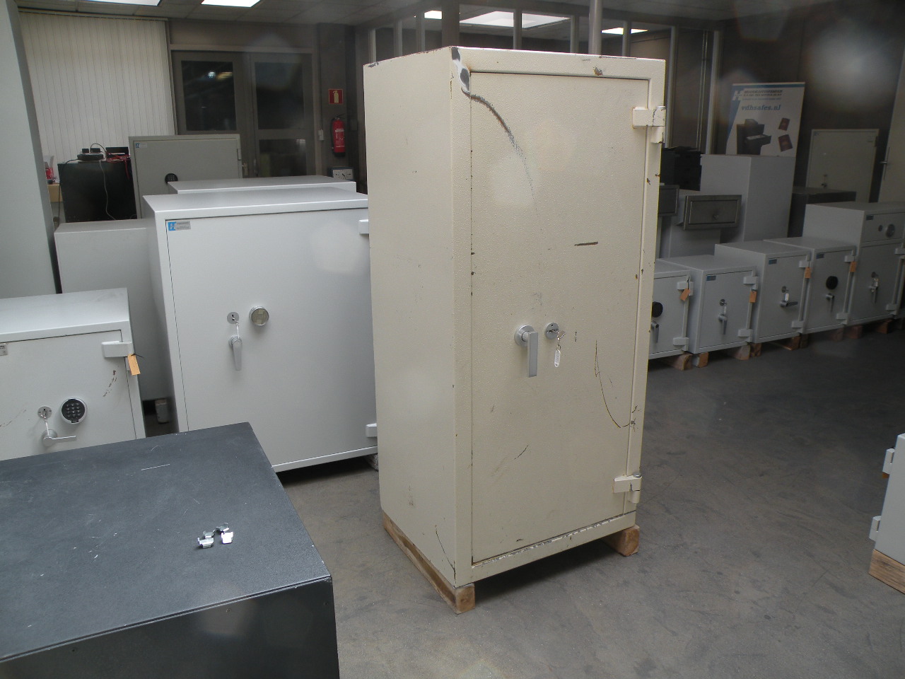 Brand- en inbraakwerende kluis van het merk MÜLLER SAFE Gnbm model EN II- 160. Gecertificeerde inbraakwering volgens de EN 1143-1 klasse 2 normering. Dekkingsadvies verzekeraars op basis van normering contant geld € 25.000,– kostbaarheden verzekering € 50.000,–. Brandwerende eigenschappen Din 4102 Normering (30 minuten) voor het veilig opbergen van contant geld, waardevolle voorwerpen en of documenten. Deze gecertificeerde kluis is voorzien van een sleutelslot inkl 2 sleutels EN 1300 klasse A, 3 stuks verstelbare legborden. De kluis heeft aan de buitenzijde veel lakbeschadiging. Indien gewenst kan de kluis opnieuw van binnen en buiten worden gespoten in een lichtgrijze lak. Levering met 1 jaar garantie. Indien gewenst is het mogelijk om de kluis bij plaatsing door Van den Hoven te laten verankeren aan de vloer d.m.v. 1 stuks chemisch anker.