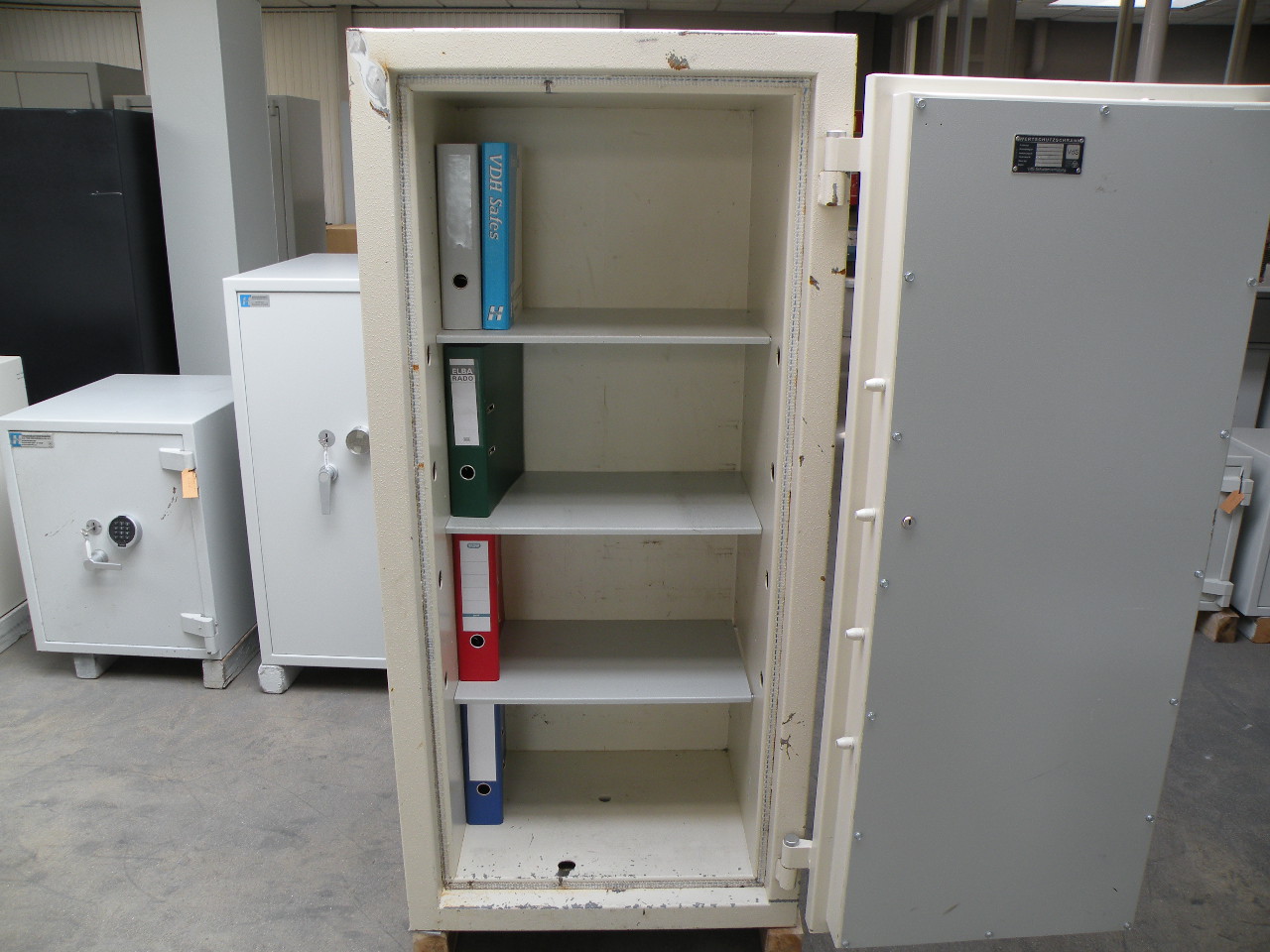 Brand- en inbraakwerende kluis van het merk MÜLLER SAFE Gnbm model EN II- 160. Gecertificeerde inbraakwering volgens de EN 1143-1 klasse 2 normering. Dekkingsadvies verzekeraars op basis van normering contant geld € 25.000,– kostbaarheden verzekering € 50.000,–. Brandwerende eigenschappen Din 4102 Normering (30 minuten) voor het veilig opbergen van contant geld, waardevolle voorwerpen en of documenten. Deze gecertificeerde kluis is voorzien van een sleutelslot inkl 2 sleutels EN 1300 klasse A, 3 stuks verstelbare legborden. De kluis heeft aan de buitenzijde veel lakbeschadiging. Indien gewenst kan de kluis opnieuw van binnen en buiten worden gespoten in een lichtgrijze lak. Levering met 1 jaar garantie. Indien …