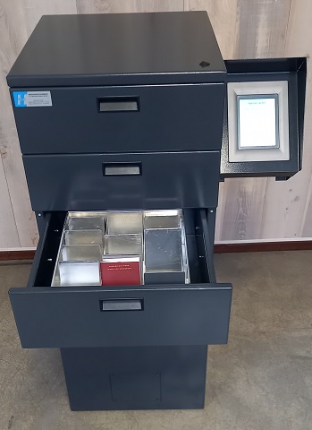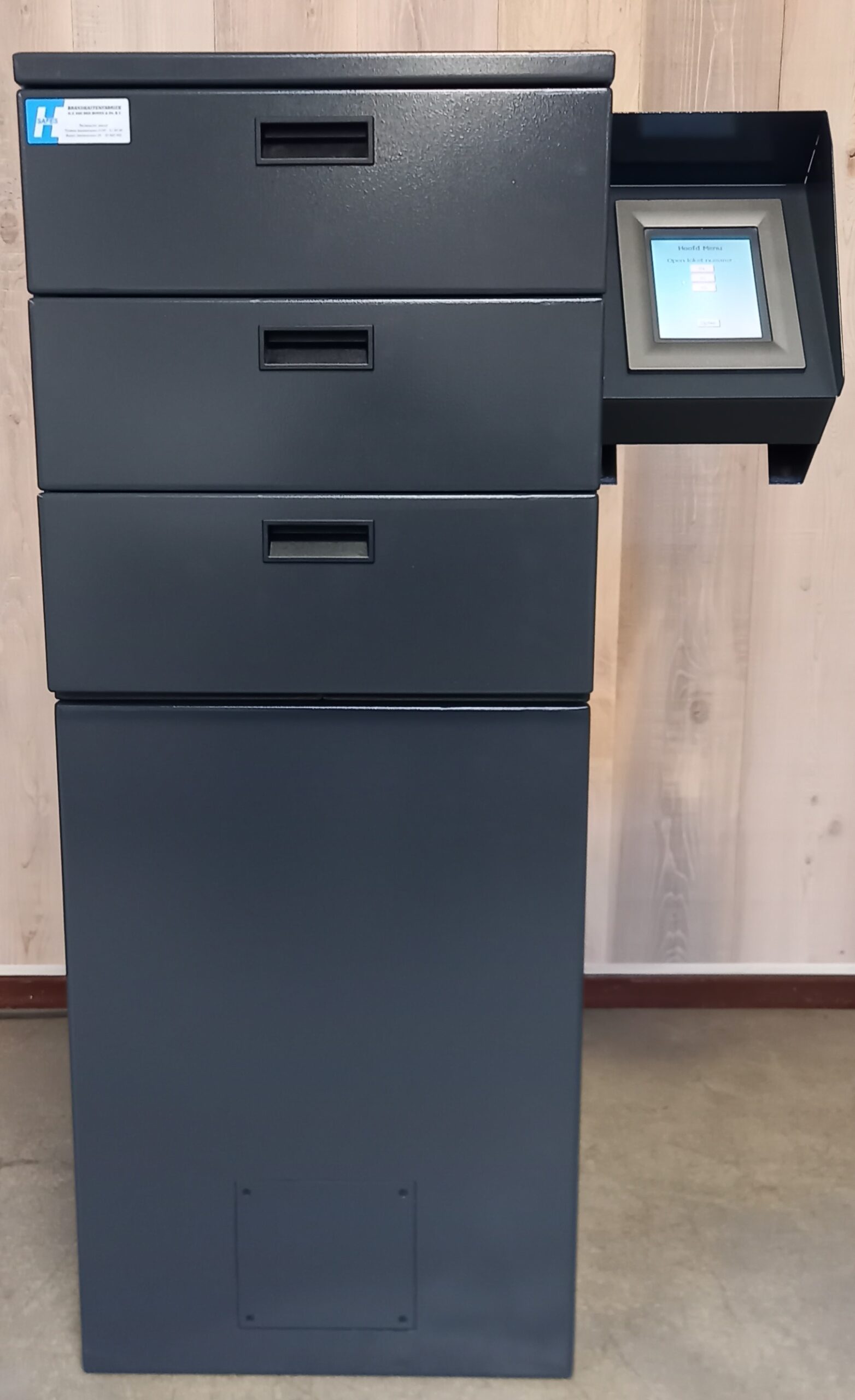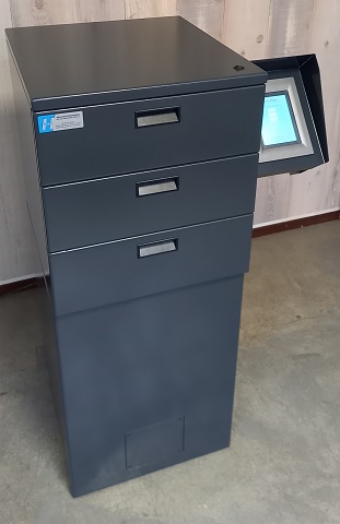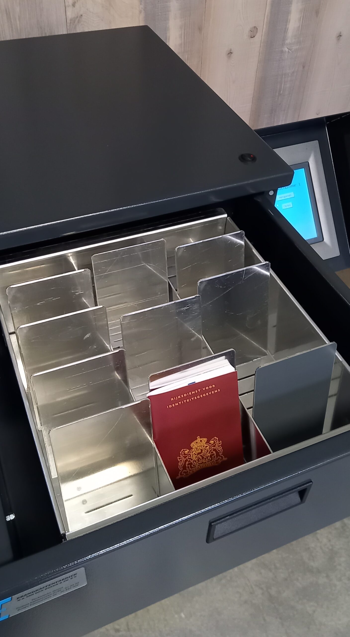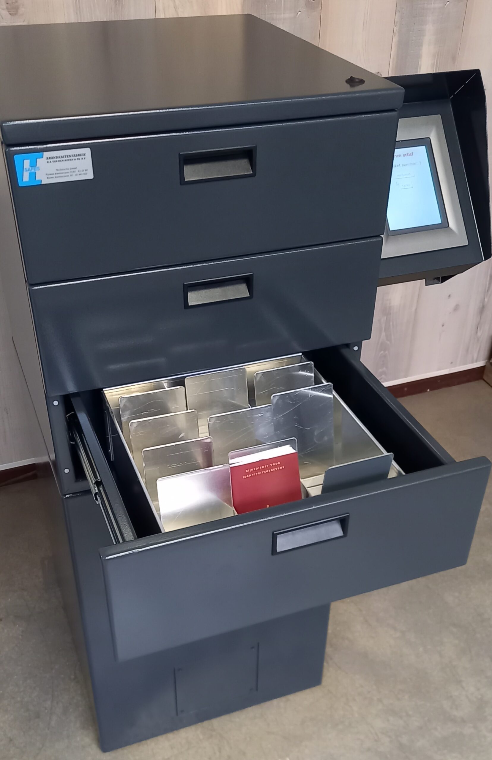 Standaard is de Paspoortbox voorzien van 3 lades. Door een gebruiksvriendelijke 5,7″ touchscreen zijn de lades te bedienen. Door een gepersonaliseerde code in te voeren opent de gebruiker een lade. Als 1 lade geopend is, kan een andere lade niet geopend worden. Bij te lang open staan van de lade (na 30 seconden) volgt een geluidssignaal zodat de gebruiker om veiligheidstechnische redenen aangespoord wordt de lade te sluiten.