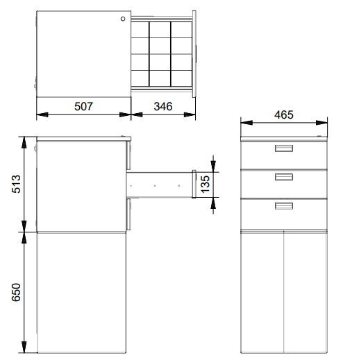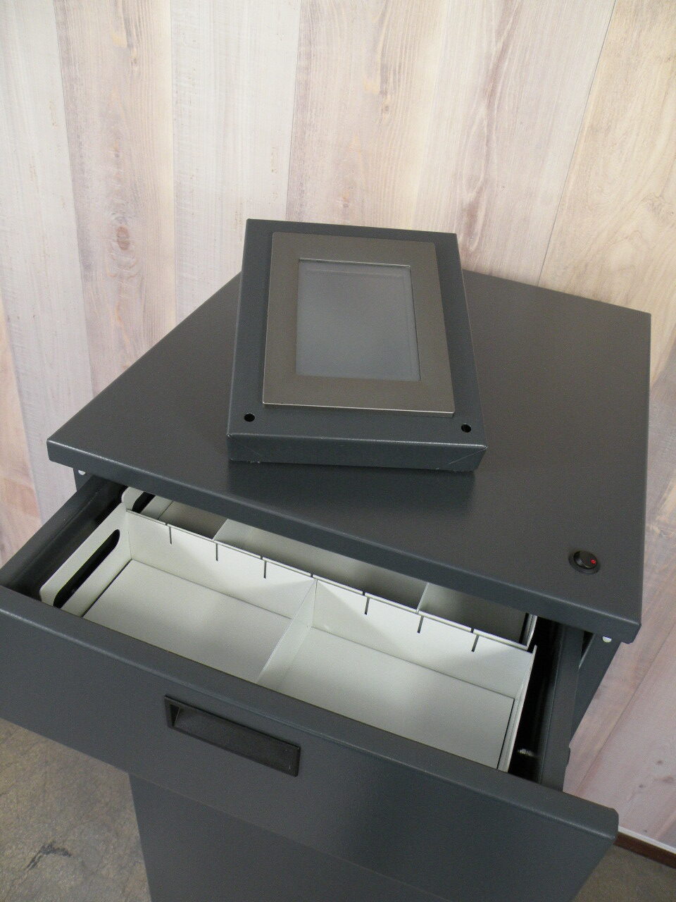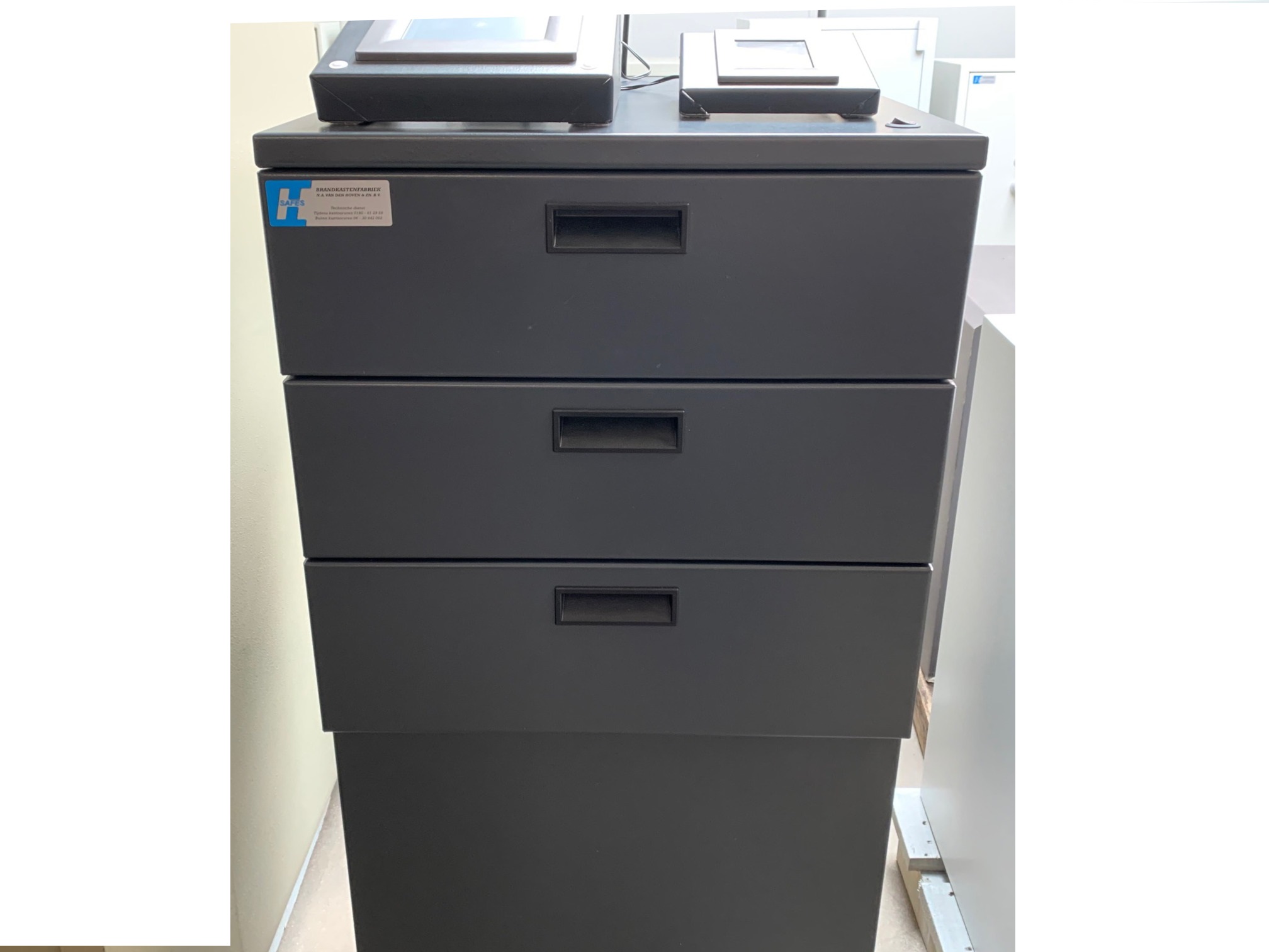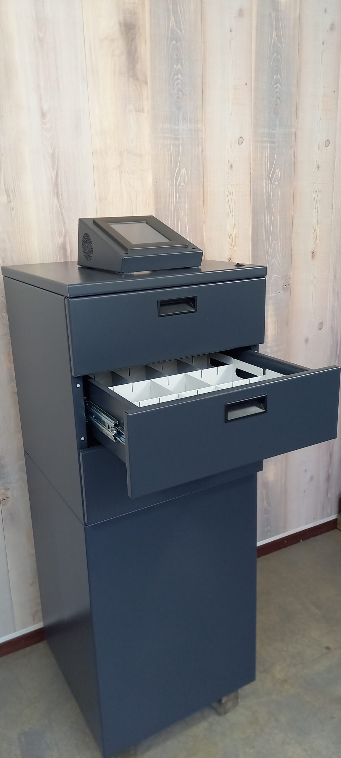 Standaard is de Paspoortbox voorzien van 3 lades. Door een gebruiksvriendelijke 5,7″ touchscreen zijn de lades te bedienen. Door een gepersonaliseerde code in te voeren opent de gebruiker een lade. Als 1 lade geopend is, kan een andere lade niet geopend worden. Bij te lang open staan van de lade (na 30 seconden) volgt een geluidssignaal zodat de gebruiker om veiligheidstechnische redenen aangespoord wordt de lade te sluiten.