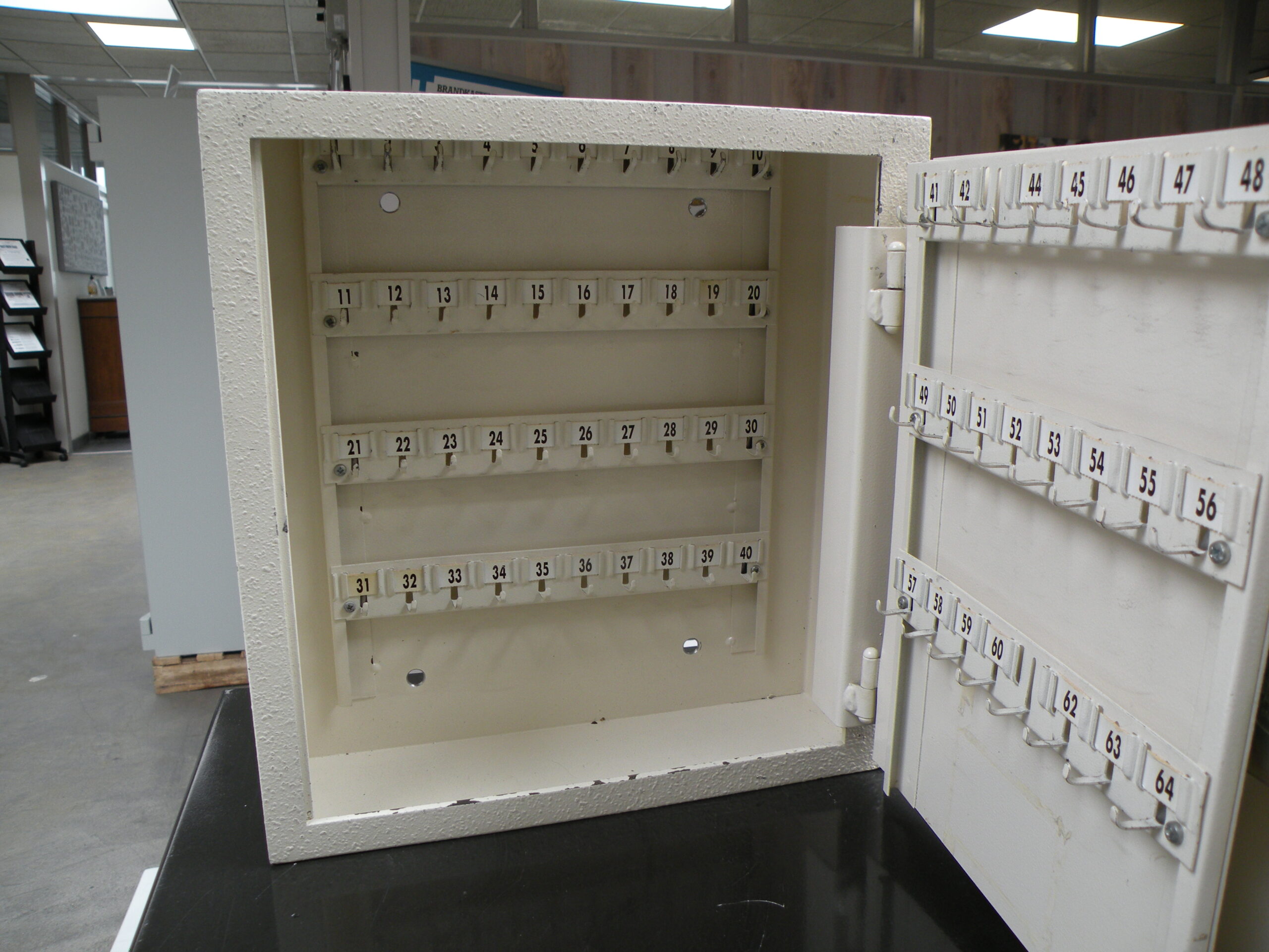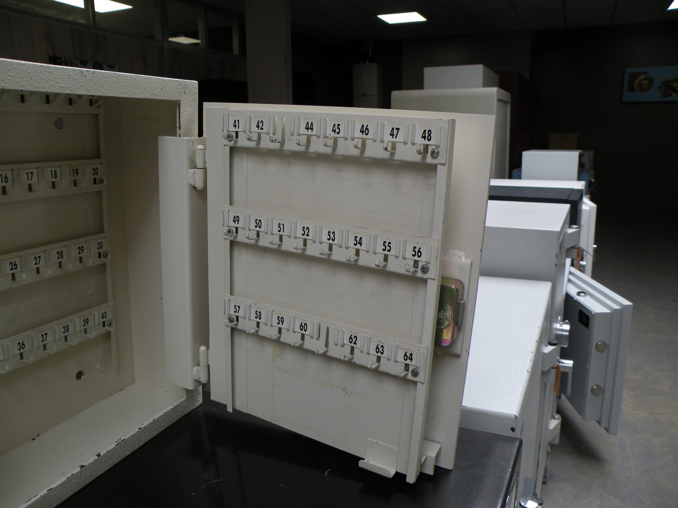 Voorzien van 64 genummerde sleutelhaken en een mechanisch verstelbaar cijferslot.