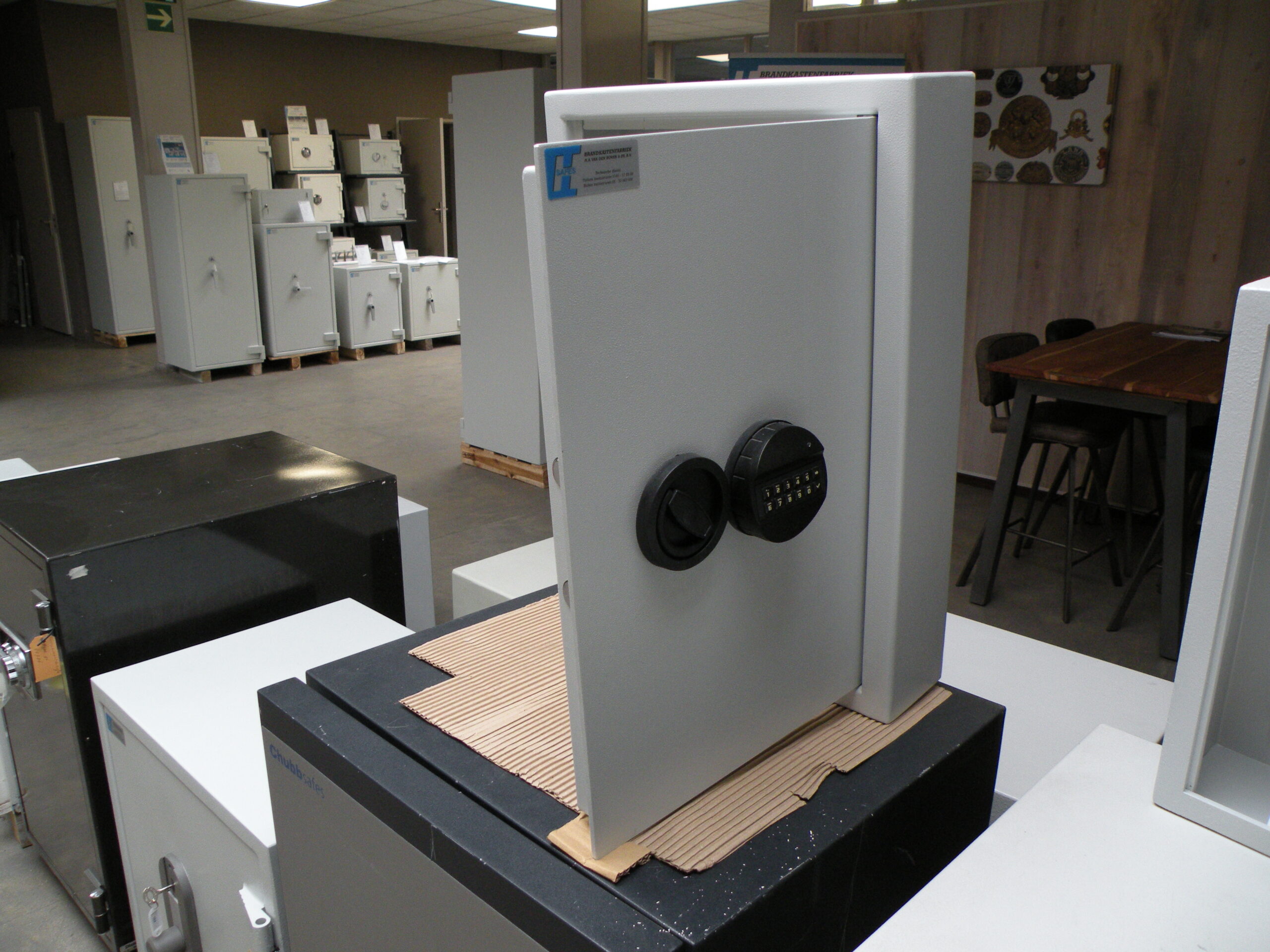 De deur is voorzien van vierzijdig sluitmechanisme en een verstelbaar elektronisch cijferslot.