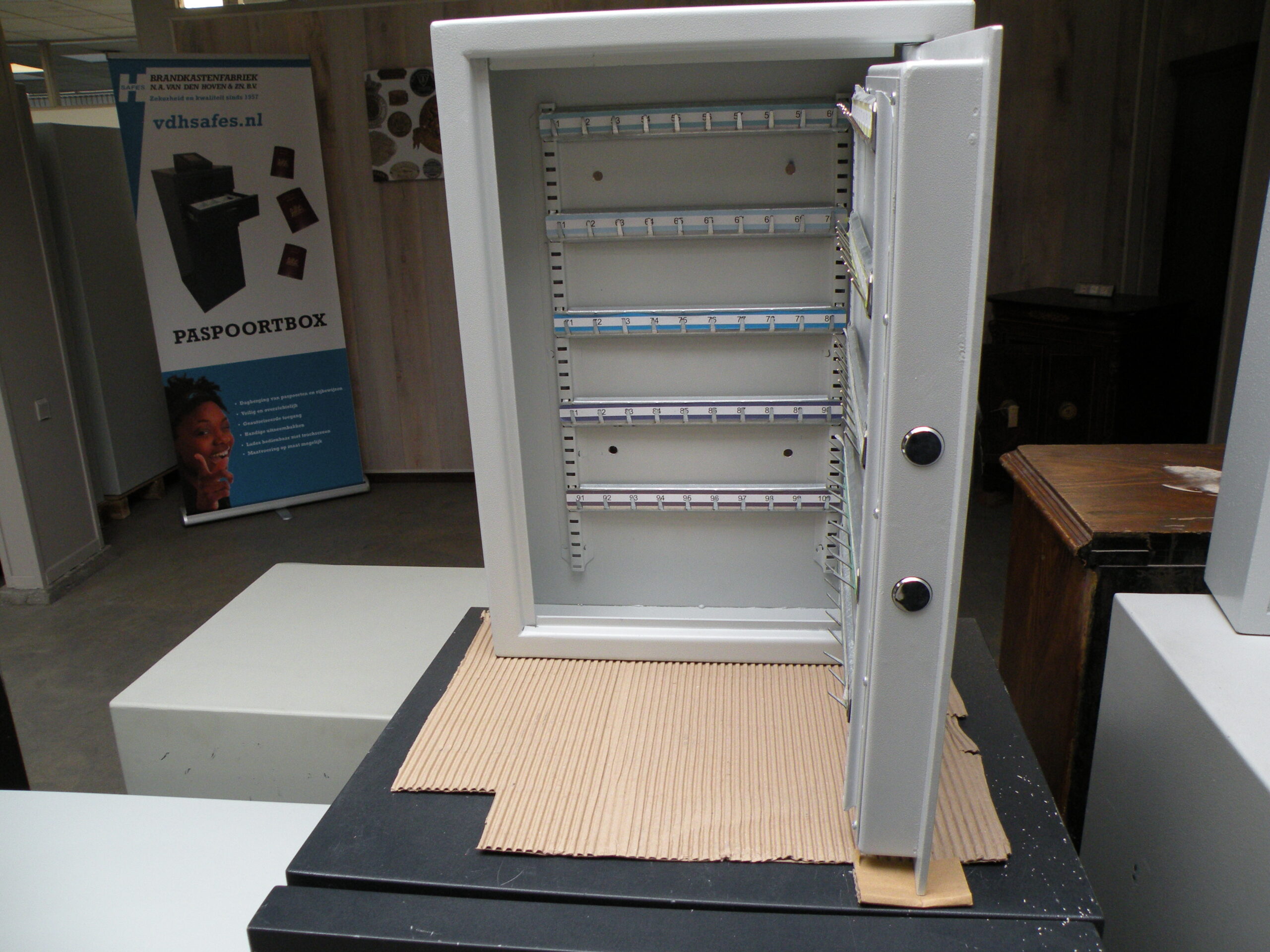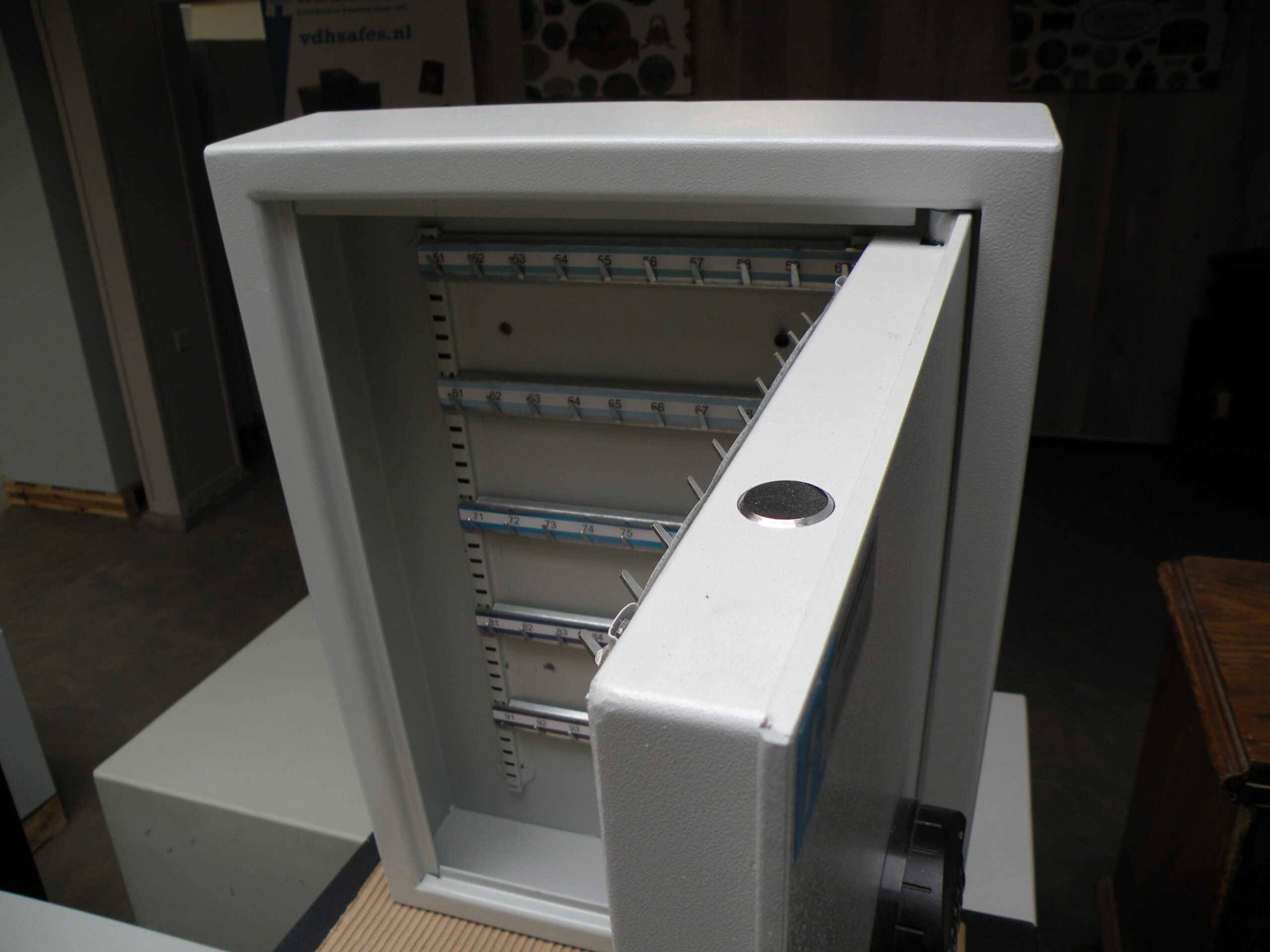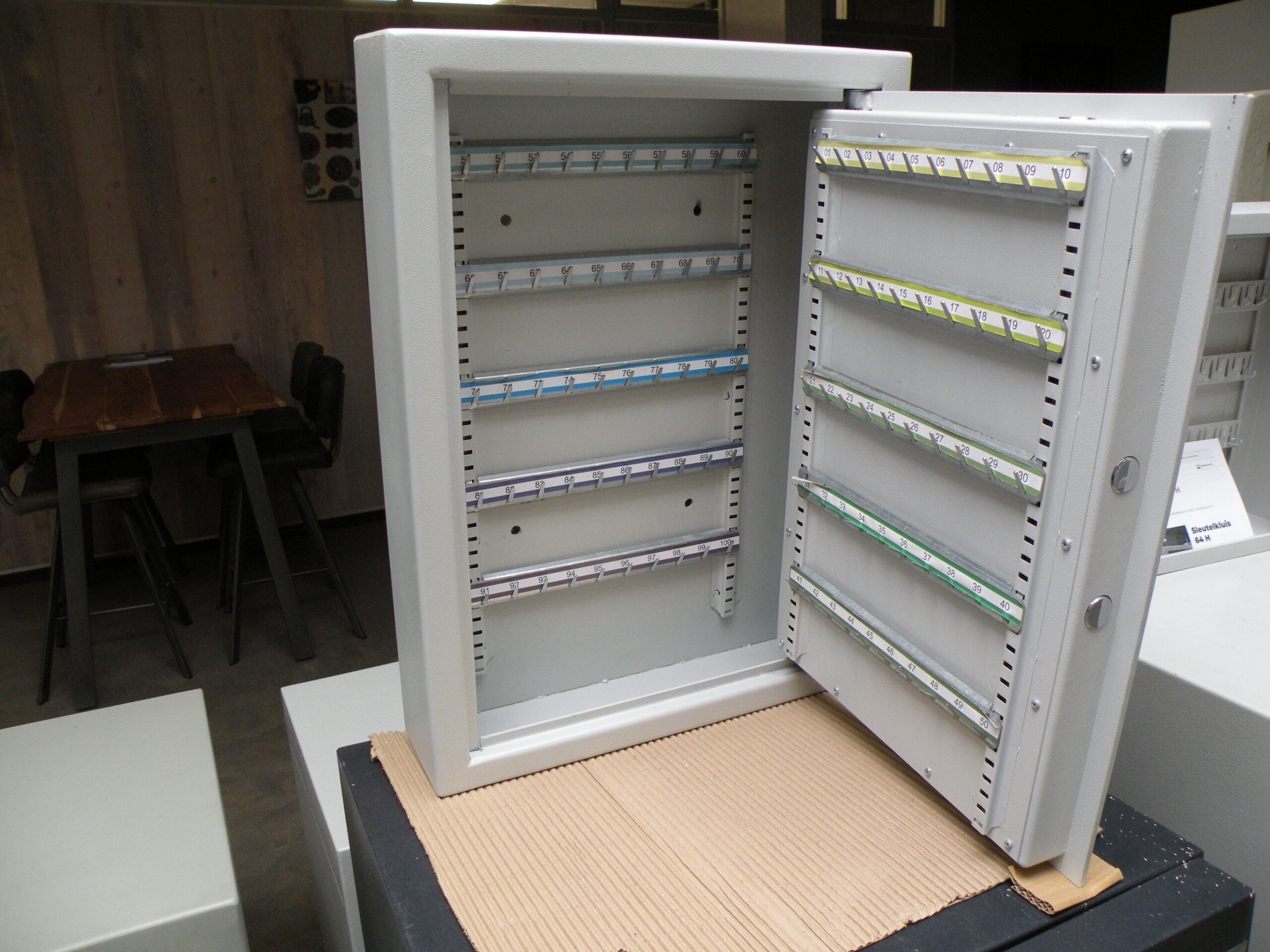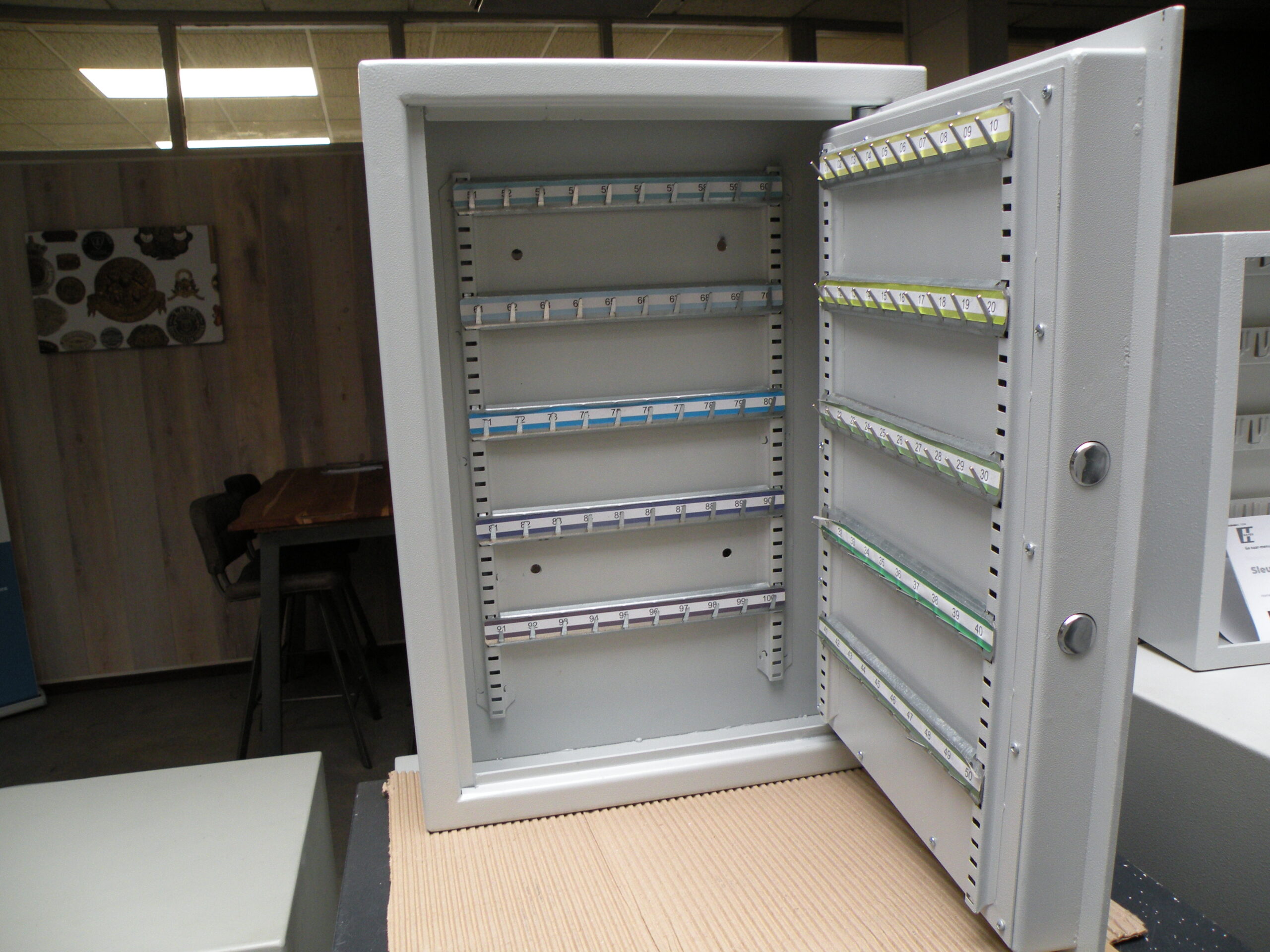 De kluis is voorzien van 100 stuks genummerde sleutelhaken.