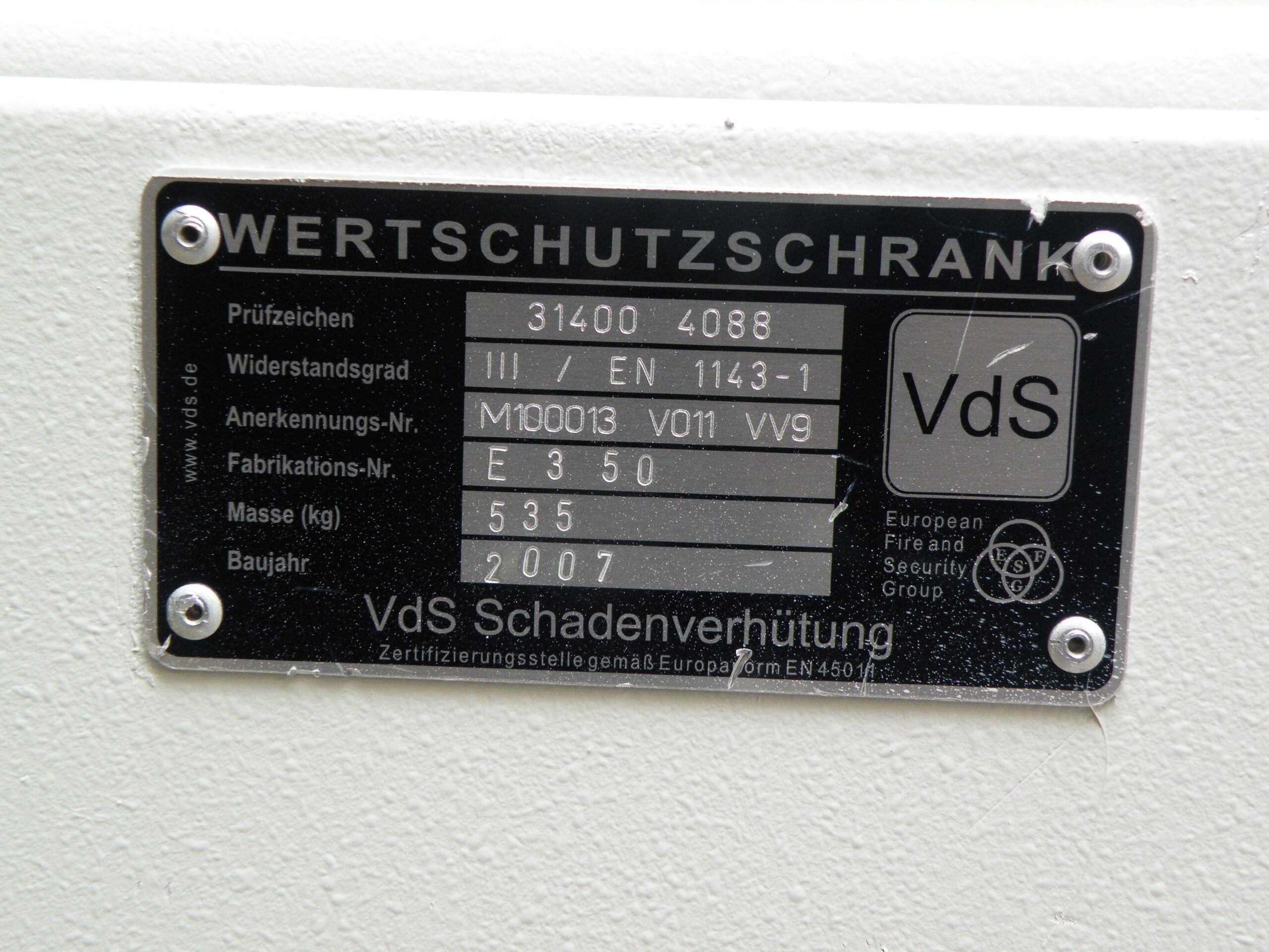 Certificirana protivlomna zaščita v skladu s standardom EN 1143-1, standardizacijski razred 3. Priporočeno kritje zavarovalnic v gotovini 45.000,00 EUR. Dragocenosti na podlagi standardizacije 90.000,00 €.